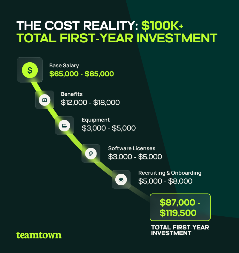 Total first-year cost: $96,000-$104,000. That is before you include recruiting fees for agency hires. It also does not include onboarding time. It does not include the ramp-up period, when productivity increases slowly.