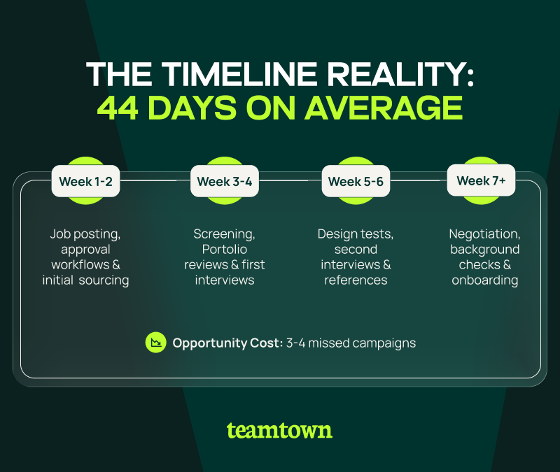 These aren't outlier cases. The 44-day average includes posting the role, screening resumes, conducting multiple interview rounds, checking references, and negotiating offers. Factor in notice periods at candidates' current employers, and you’re often looking at 8 to 10 weeks. Then your new designer can start. That's two months of campaigns delayed, launch windows missed, and creative bottlenecks unresolved.